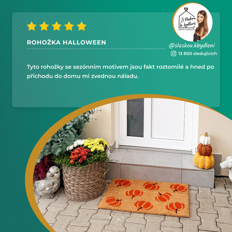Rohožka s oranžovými tekvicami pripomína jesenné obdobie, kedy sa na Halloween dlabia tekvice a chodia sa koledovať. Vonkajšie dvere samozrejme môže zdobiť celoročne a môžete si byť istí, že Vám perfektne očistí topánky kedykoľvek budete potrebovať. Má totiž vysoký vlas z hrubého kokosového vlákna.