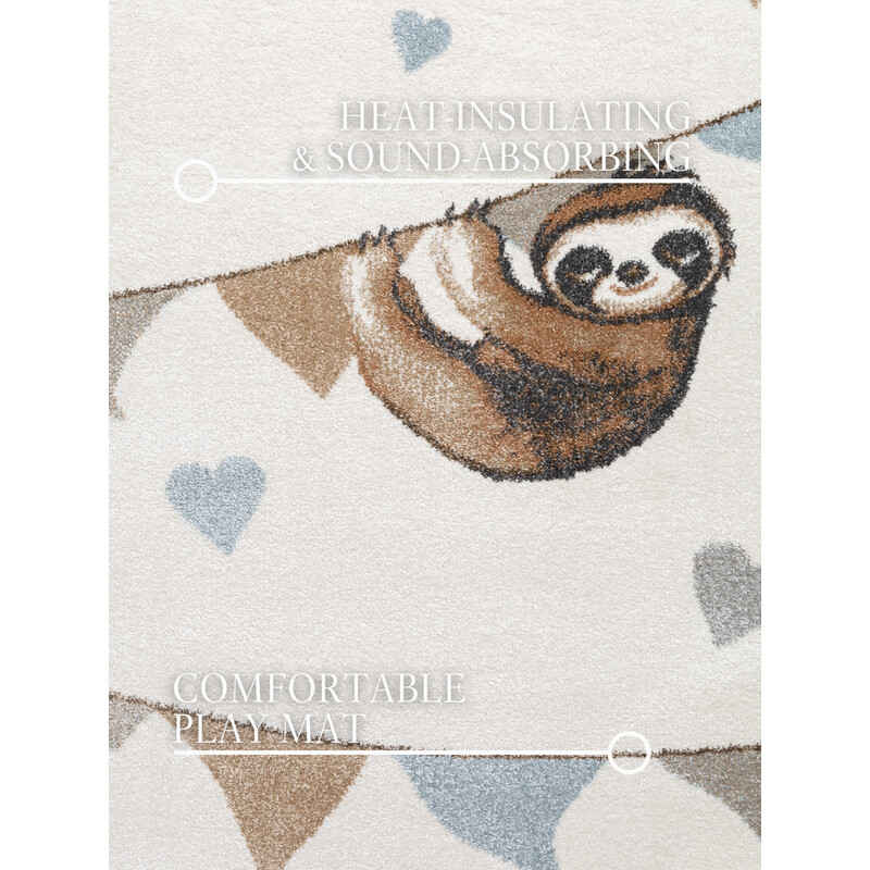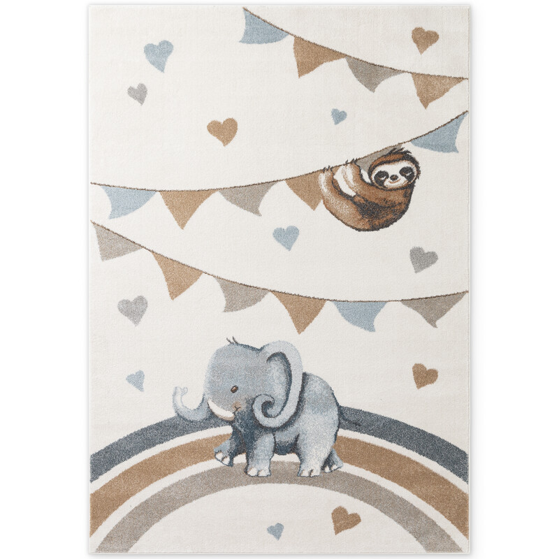 Krémovo biely koberec rozpráva veselý príbeh o slonovi, ktorý sa s ľahkosťou prechádza po dúhe, zatiaľ čo jeho kamarát leňochod sleduje svet s typickým pokojom a úsmevom. Jemné pastelové farby a mäkké kontúry vytvárajú radostnú a prívetivú atmosféru, ktorá rozvíja detskú fantáziu. Hebký povrch je ideálny na hranie, lezenie aj odpočinok, zatiaľ čo ľahká...