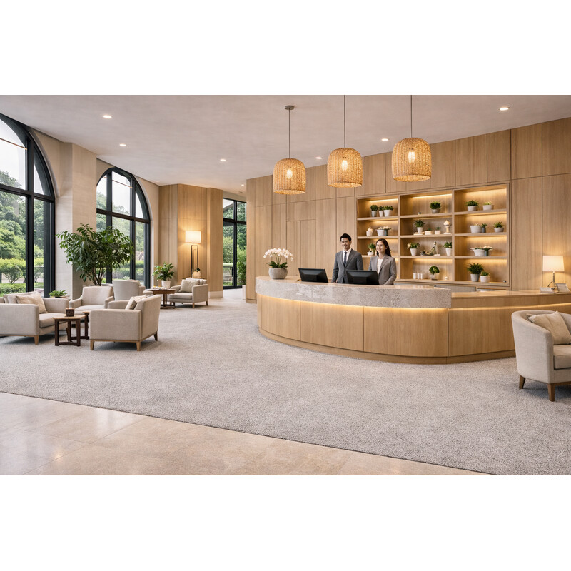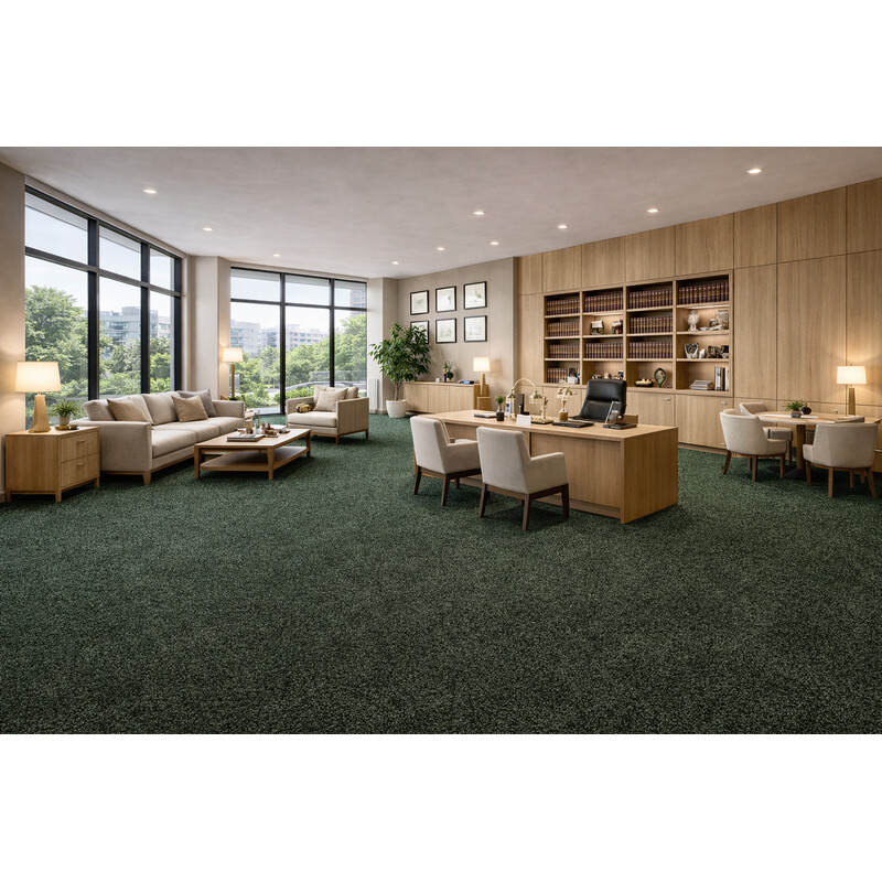 Tmavo zelený koberec urobí v každom komerčnom interiéri parádu. Získa si Vás ale aj celým radom praktických vlastností. Je odolný, kompatibilný s kolieskami stoličiek, ľahký na údržbu a dobre tlmí hluk. To všetko zaisťuje krátky smyčkový vlas a syntetická podložka na rubovej strane.