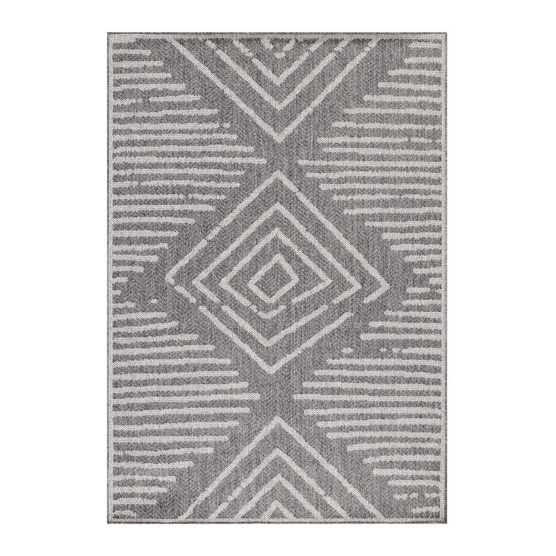 Šedý koberec s kosoštvorcami uprostred a pruhy po dlhších stranách. Tento zaujímavý geometrický vzor sa bude skvele vynímať v chodbe, kuchyni, jedálni aj na terase. Koberec je totiž odolný voči poveternostným vplyvom a ľahko udržateľný, a preto ho môžete položiť aj do exteriéru.