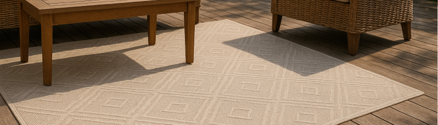 Vonkajší koberec v béžovej farbe s tromi kosoštvorcami uprostred a tromi lemujúcimi pruhmi na kratších stranách. Tento podarený kúsok sa môže pýšiť 3D efektom, ktorý zaisťuje kombinácia rôzne vysokému slučkového vlasu. Medzi ďalšie prednosti patrí odolnosť, ľahká údržba či antistatická úprava.