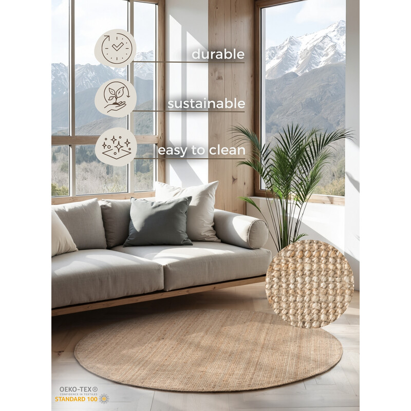 Tento oválny béžový koberec zaujme svojim prirodzeným vzhľadom vďaka jemne pletenej štruktúre zo 100% juty, ktorá dodá interiéru útulný a rustikálny nádych. Vďaka prírodnému materiálu je odolný a ľahko sa udržuje, pričom juta prirodzene odpudzuje prach. Koberec je ekologický a bezpečný pre zdravie, čo dokazuje aj certifikát OEKO-TEX.