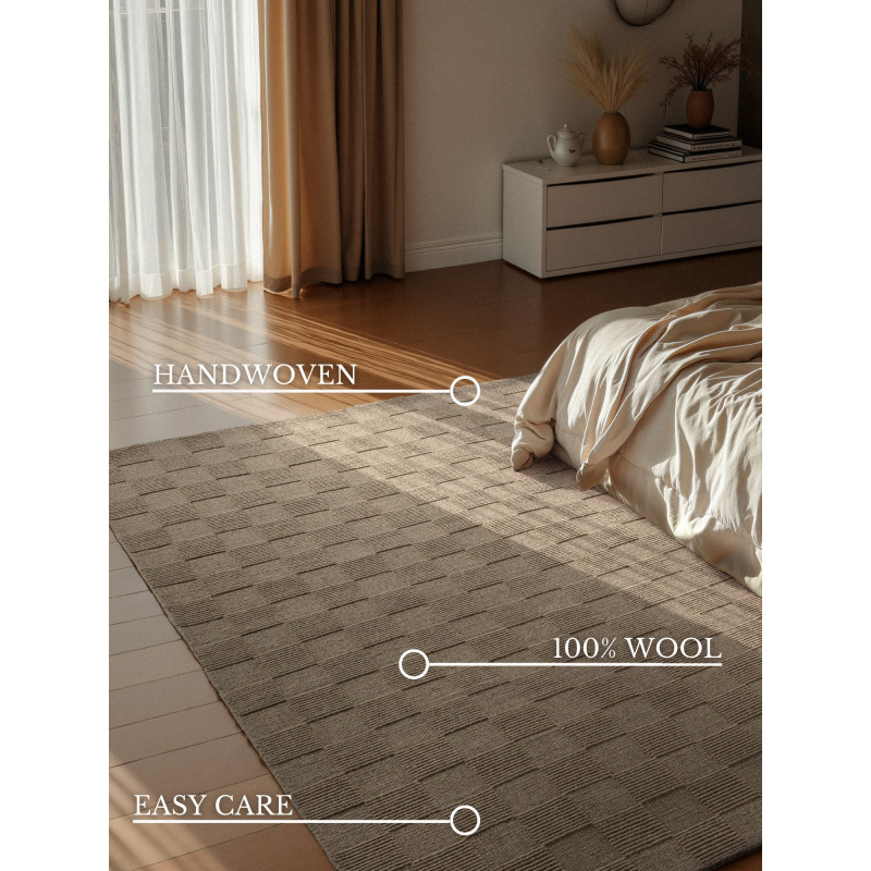 Tmavo béžový až hnedý koberec sa vyznačuje plastickým štvorcovým motívom, ktorý vytvára pôsobivý 3D efekt a opticky pripomína šachovnicu. Kombinácia prírodných tónov dodá interiéru teplý a útulný charakter, zatiaľ čo ručne tkaná vlna zaisťuje vysokú odolnosť aj dlhú životnosť. Povrch je príjemný na dotyk a vďaka svojim vlastnostiam tiež tlmí hluk a...