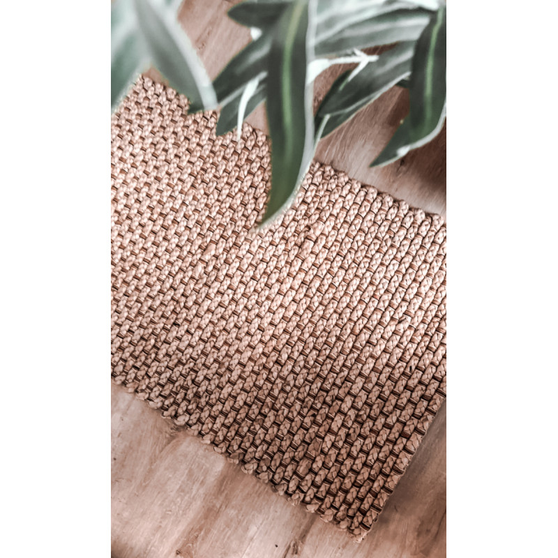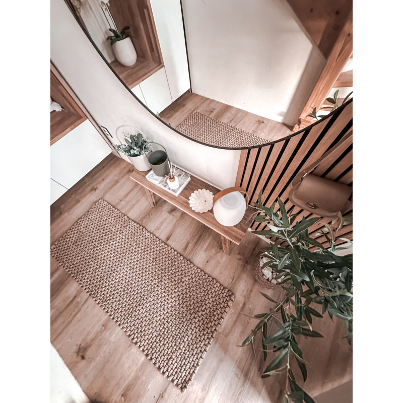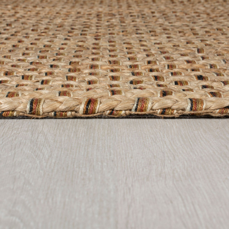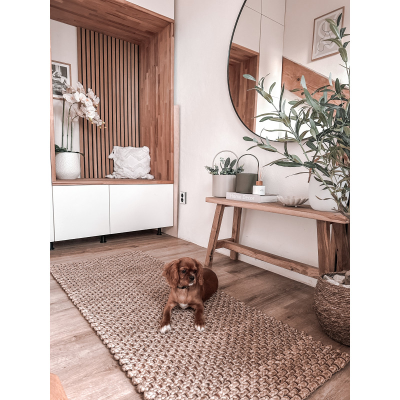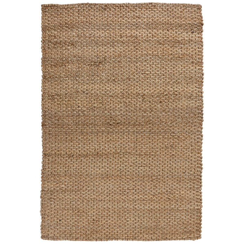 Na prvý pohľad vyzerá ako nenápadný béžový koberec. Pri detailnom pohľade však zistíte, že sa jedná o pozoruhodný kúsok, ktorého základom sú slučky z juty. Tie sú doplnené farebnými tenkými vrkôčikmi z juty a na rubovej strane je vrstva z bavlny. Tento podarený koberec sa najlepšie hodí do spálne alebo obývacej izby, ale odolá aj vyššej záťaži, napríklad...
