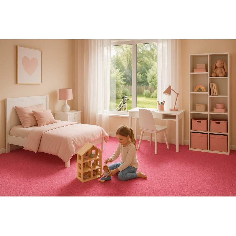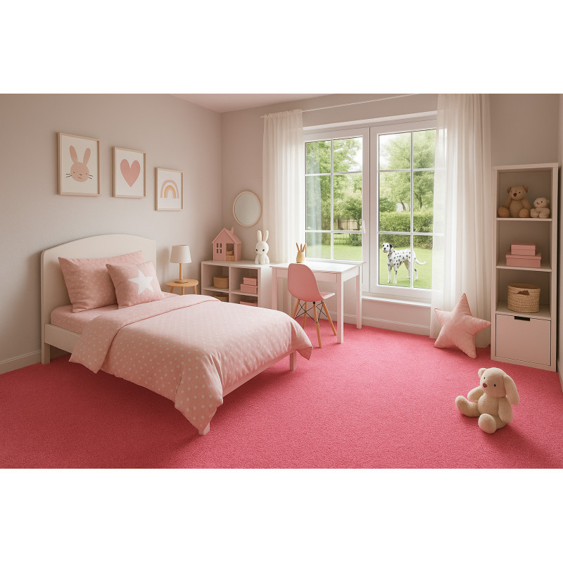 Nádherný metrážny koberec z kolekcie Dynasty v dievčenské ružovej farbe. Tento bytový koberec so strihaným vlasom (saxon) má filcový podklad a hodí sa na podlahové vykurovanie. Koberec je vhodný do stredne namáhaných bytových priestorov. Vďaka ružovej farbe ho môžete použiť ako do obývacej izby, tak napríklad do dievčenského izbičky.