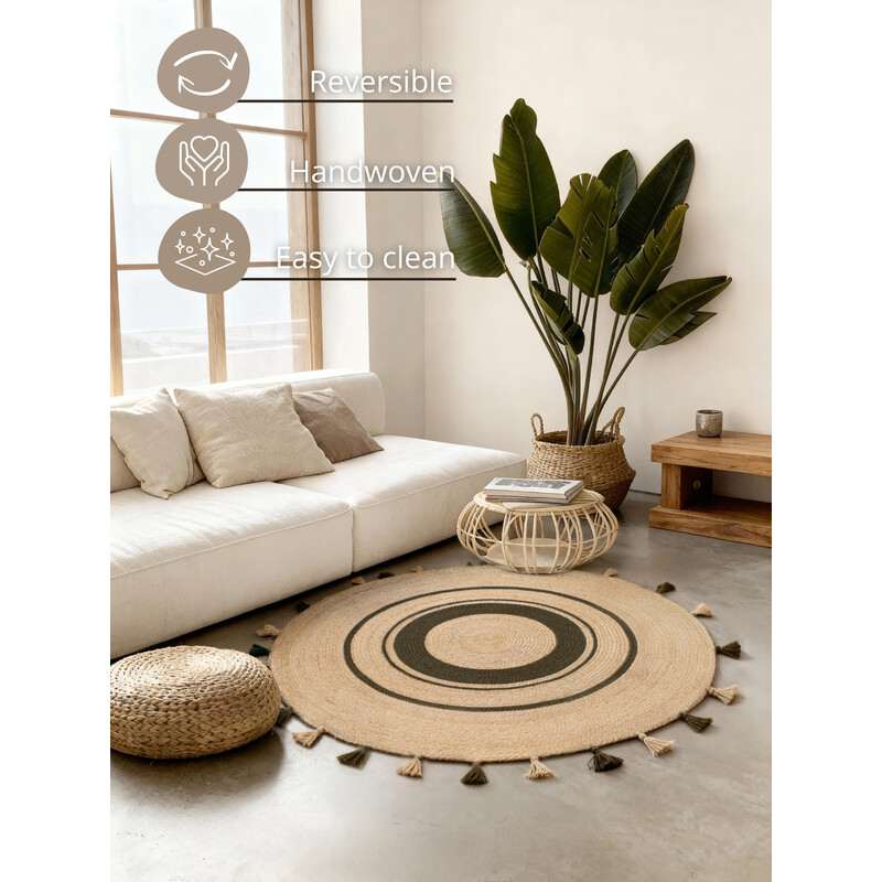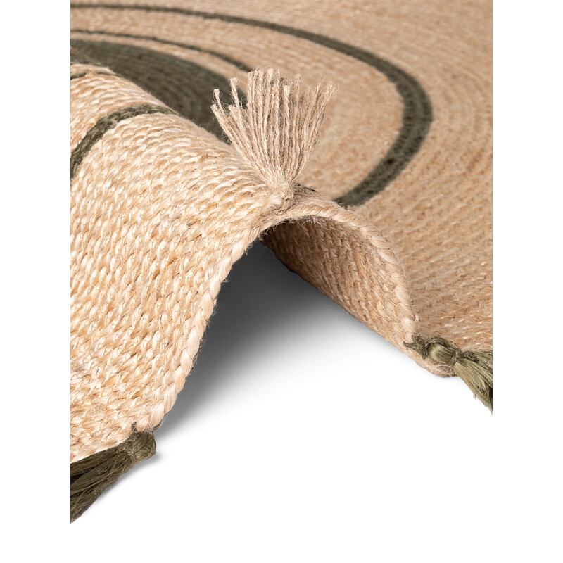 Jutový koberec v kruhovom tvare, ktorý je ako malé slnko pre váš interiér – hrejivý, prírodný a príjemne upokojujúci. Pletený vzor so zelenými kruhmi vytvára hravý detail, ktorý zaujme, ale nepôsobí rušivo. A tie strapce po obvode? Taká malá radosť navyše, ktorá dodá priestoru ľahkosť.