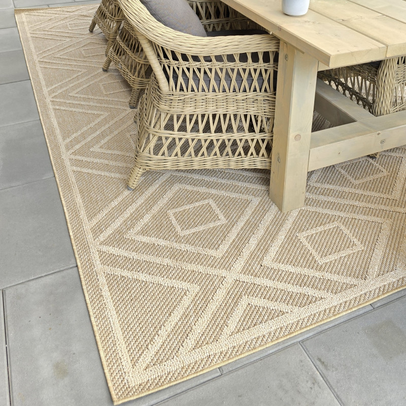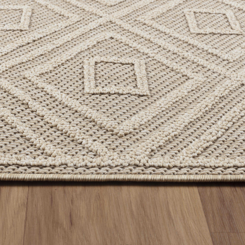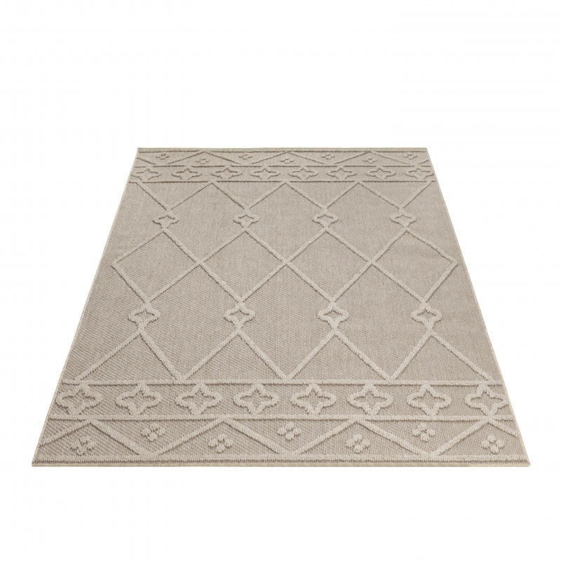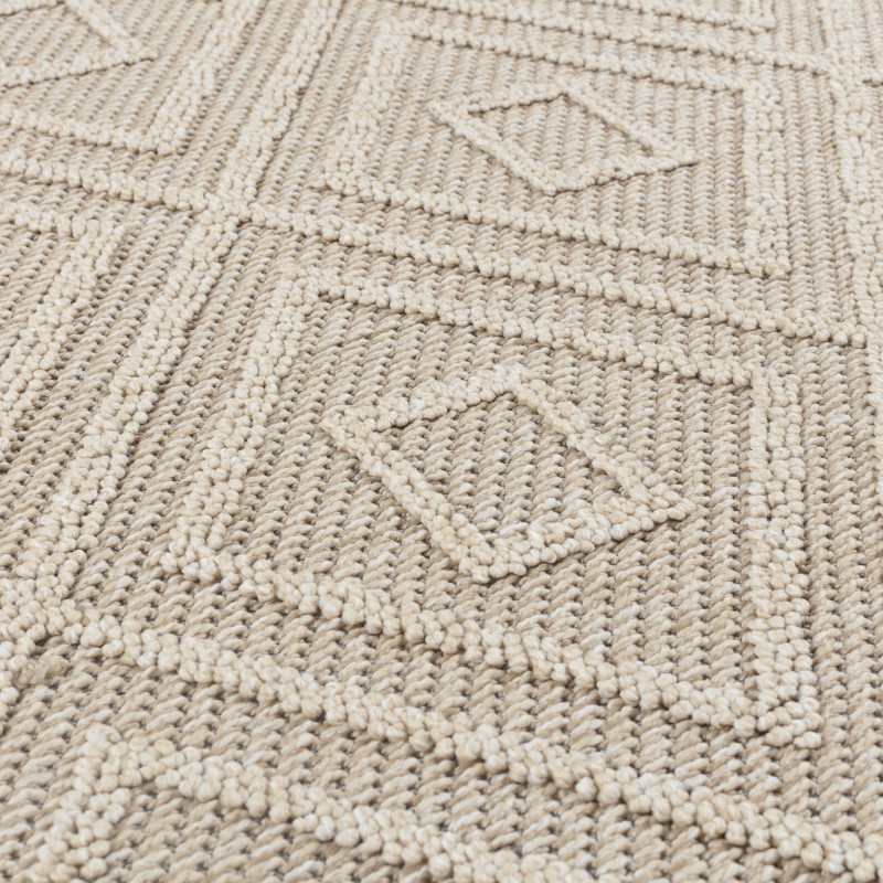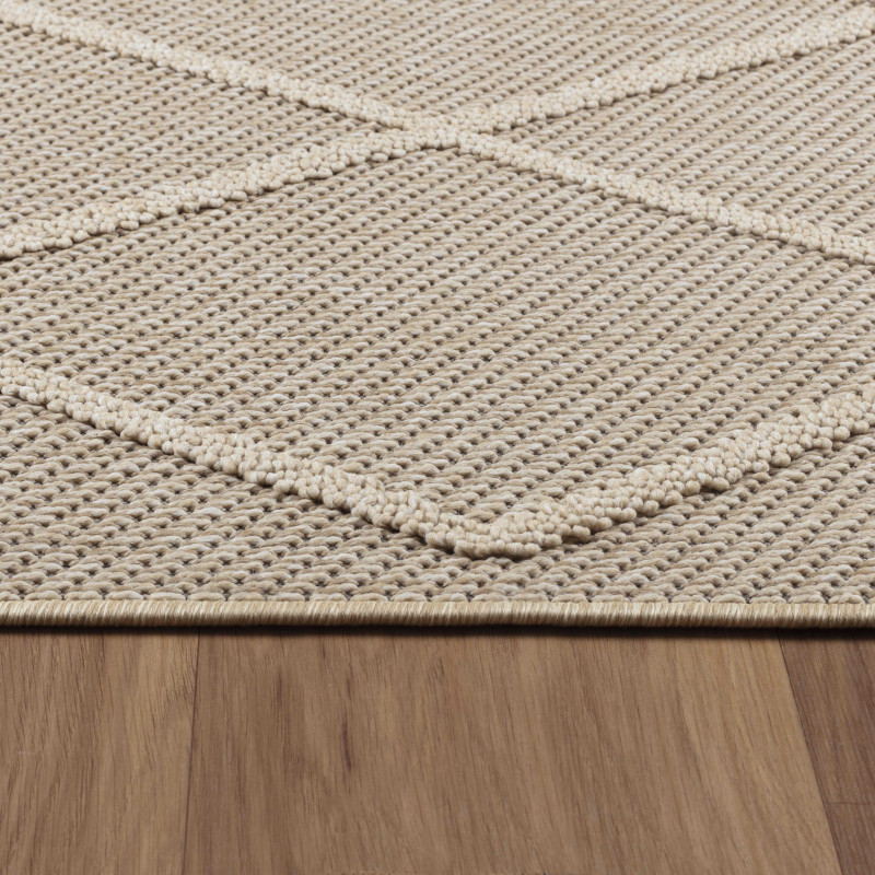 Moderný koberec v béžovej farbe posiaty kosoštvorcami, ktoré majú uprostred malé obdĺžniky. Tento podarený geometrický motív je navyše plastický, čo zaisťuje kombinácia rôzne vysokého slučkového vlasu. Koberec sa ďalej vyznačuje odolnosťou, antistatickou úpravou a jednoduchou údržbou.