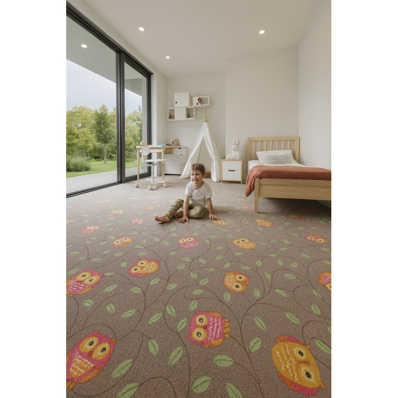 Detský metrážny koberec Little Owls je ideálnou voľbou do každej detskej izby! Tento hravý a pritom univerzálny koberec v hnědé farbe je ozdobený roztomilými kreslenými sovičkami, ktoré zaujmú každé dieťa. Vďaka nízkemu slučkovému vlasu z polyamidu je koberec príjemný na dotyk, veľmi odolný a ľahko udržiavateľný. Spodná vrstva z filcu zaisťuje skvelú...