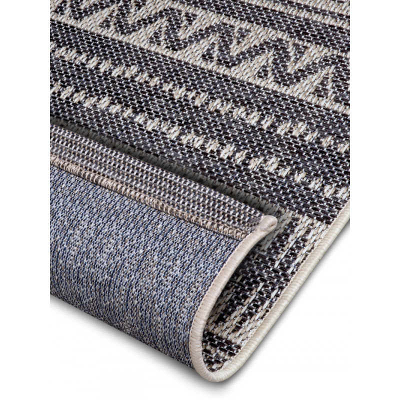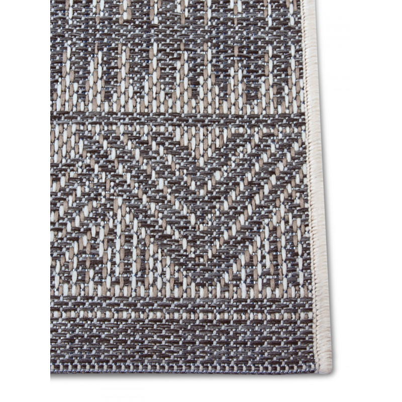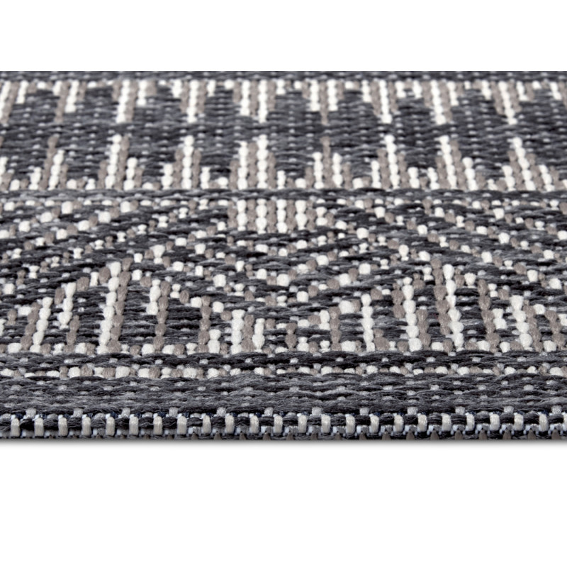 Tmavosivý koberec so svetlými obrysmi geometrických tvarov a lemovaním po obvode. Má veľmi nízky slučkový vlas z polypropylénu, ktorý zaručuje odolnosť a jednoduchú údržbu. Koberec sa preto hodí nielen domov do predsiene alebo obývačky, ale skvele poslúži aj v exteriéri. Tiež ho môžete vďaka nízkemu profilu umiestniť pod nábytok.