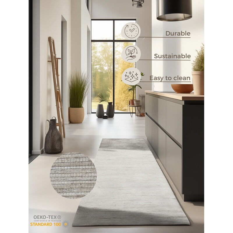 Behúň Pompei 1611 v bielej farbe a v obdĺžnikovom tvare je vyrobený zo syntetického (vegan) materiálu, ktorý je odolný proti škvrnám a nenáročný na údržbu. Tento behúň urobí parádu nielen v dlhých chodbách, ale aj v kuchyni či spálni; zjemní kroky, ochráni podlahu a opticky pretiahne priestor. Skvele doplnia interiéry, kde oceníš jednoduchosť, čisté línie...