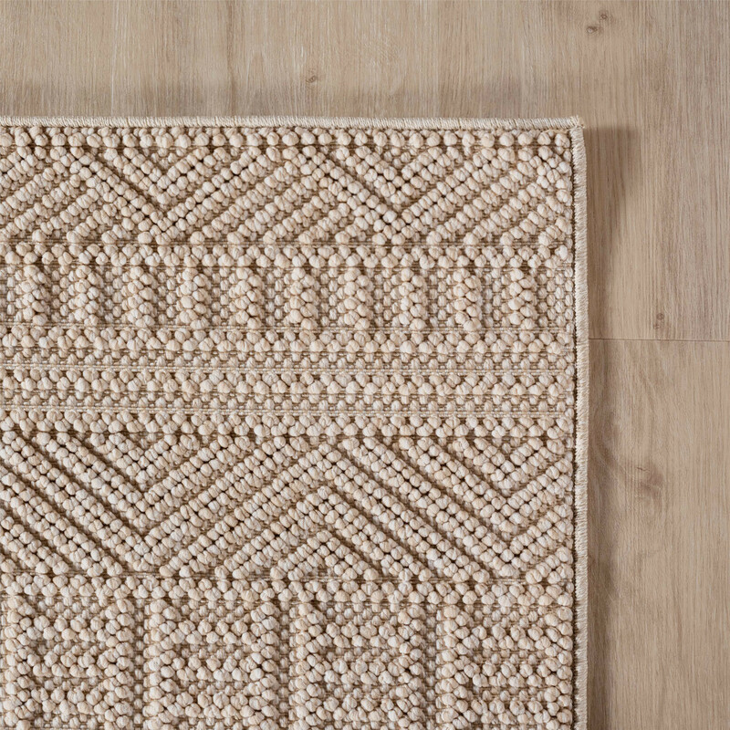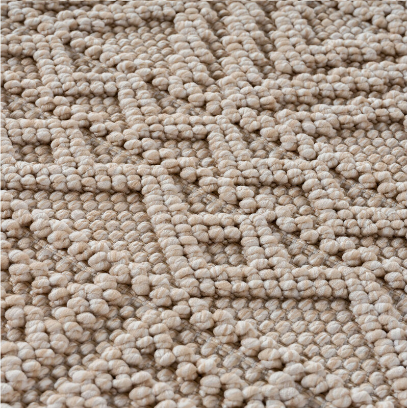 Béžovo-biely koberec s podareným geometrickým vzorom skvele poslúži nielen doma, ale aj v exteriéri. Má totiž veľmi krátke slučky namiesto klasického vlasu, a tie sú pevné, ľahké na údržbu a odolné voči poveternostným vplyvom. Ďalšou jeho výhodou je, že sa jedná o obojstranný kúsok, takže ho môžete podľa ľubovôle otáčať.