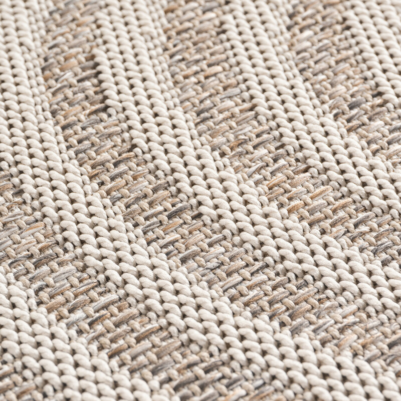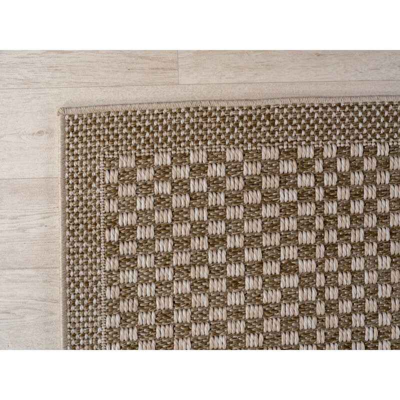 Krémový koberec doplnený šedými a béžovými obdĺžnikmi po obvode. Vyrába sa z kvalitného polypropylénu heatset, ktorý je príjemný na dotyk a dobre si drží farbu. Stredne vysoké slučky sú ľahké na údržbu a odolné. Preto koberec môžete položiť nielen doma, ale aj v exteriéri.