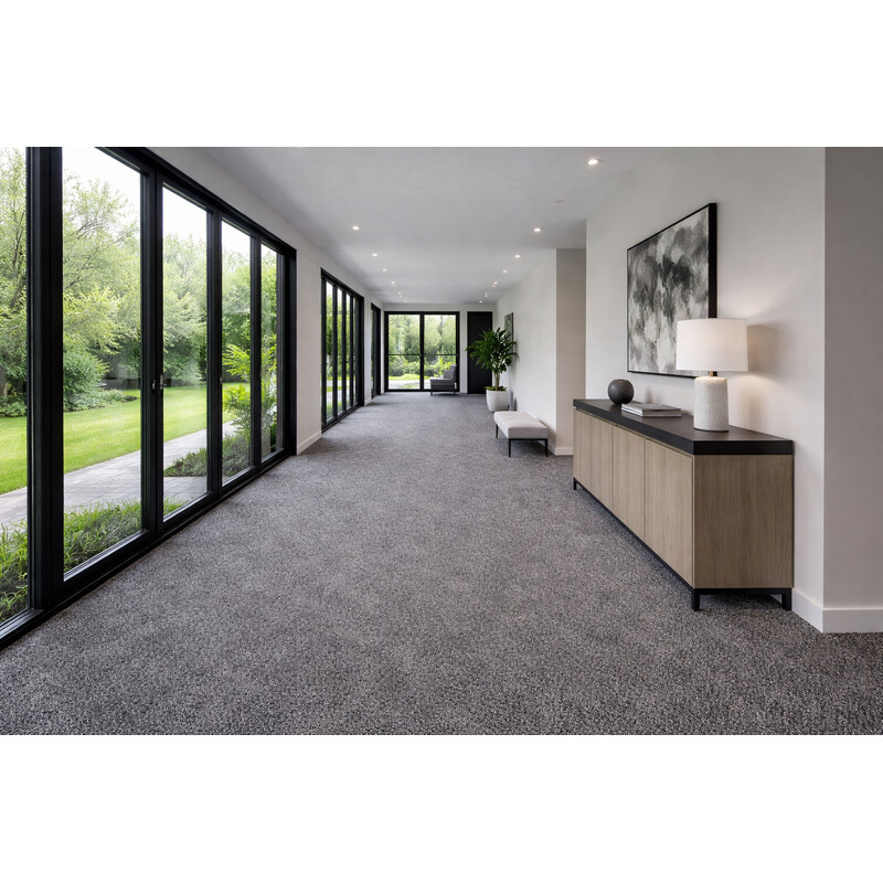 Tmavý metrážny koberec je veľmi praktický, pretože skryje drobné nečistoty. Naviac má krátky vlas, takže je ľahký na údržbu. Je vyrobený zo 100% polypropylénu a má vlas typu twist. To znamená, že je do seba zakrútený viac vlákien, a koberec je preto pružný a komfortné pri došliapnutí.