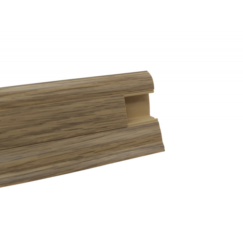 Soklová obvodová lišta SLK50 v dekore Dubového dreva pre použitie v kombinácii s PVC vrátane všetkých potrebných doplnkov ako sú rohy, spojky a koncovky. Táto lišta v sebe obsahuje káblový kanálik, kde kábel je možné ťahať aj cez jednotlivé komponenty. Lišta je opatrená mäkkými manžetami pri podlahe a stene. Vyrába sa z materiálu na báze PVC.