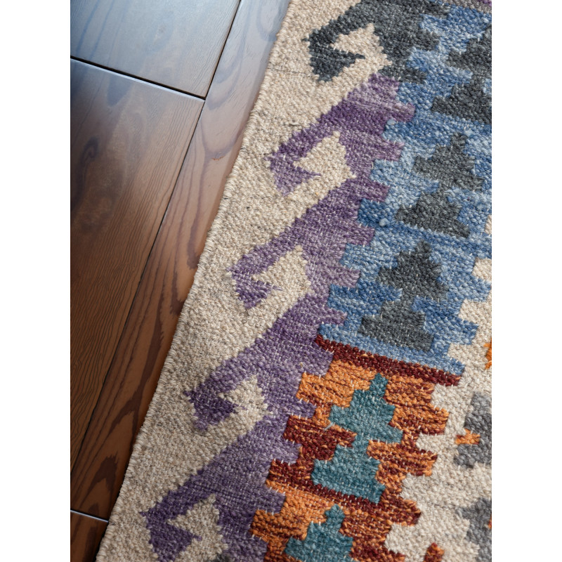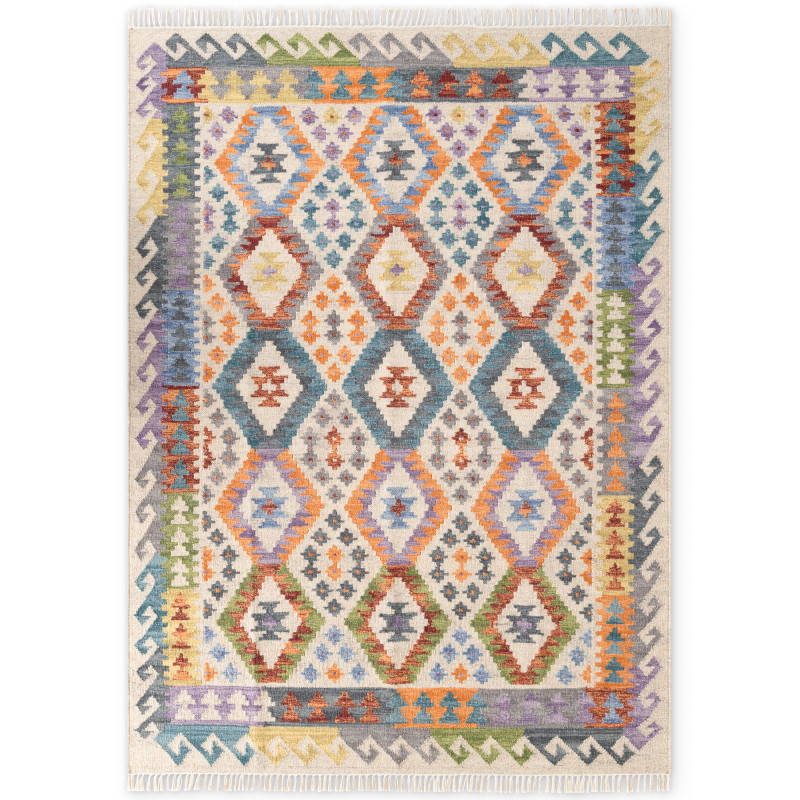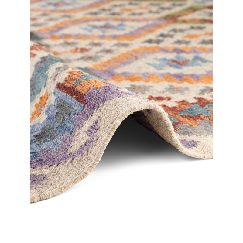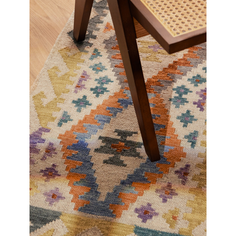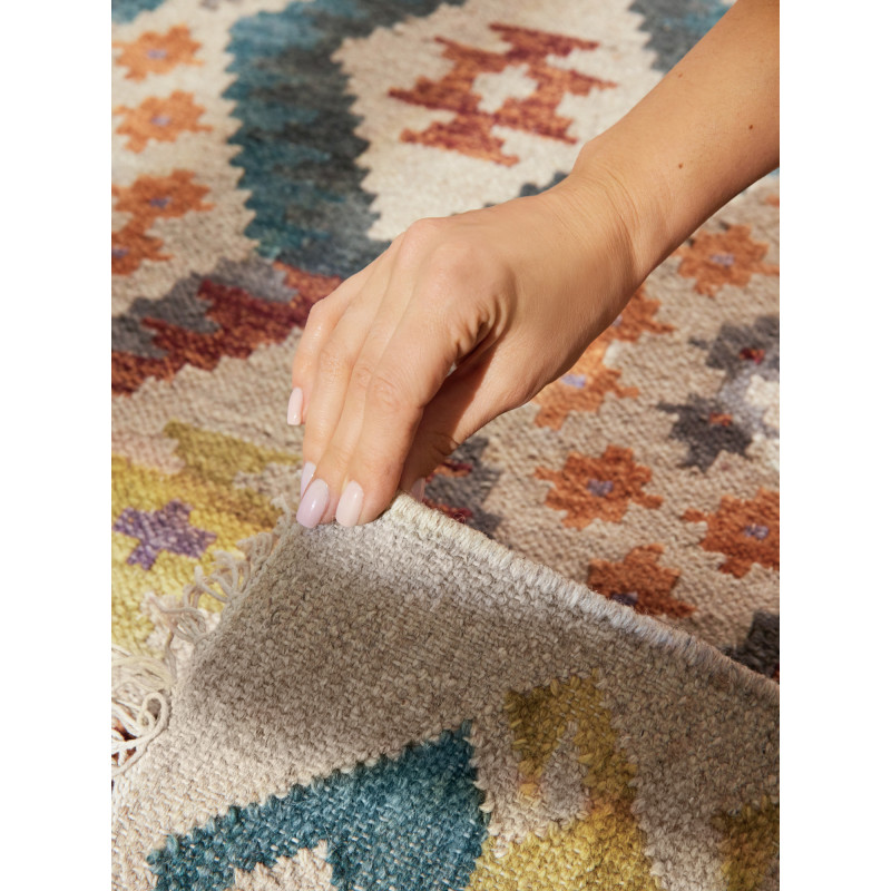 Ručne tkaný koberec Kamal Oasis v pestrých farbách spája tradičný afganský štýl s udržateľným prístupom. Kombinácia vlny a bavlny zaručuje odolnosť, mäkkosť a jednoduchú údržbu. Nízky vlas, jemné strapce a výrazný vzor z neho robia osobitý doplnok do obývačky, spálne i jedálne.