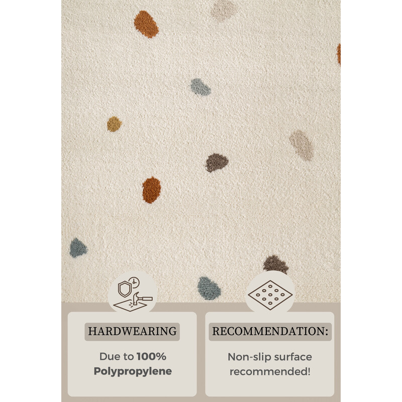Rozjasnite detskú izbu krémovo bielym kobercom s farebnými bodkami, ktorý vnesie radosť a hravosť do každého dňa! Vďaka stredne vysokému strihanému vlasu je koberec príjemný na dotyk, ľahko sa čistí a skvele vydrží každodenné detské hry. Certifikácia OEKO-TEX zaručuje, že je bezpečný aj pre tých najmenších. Obšitý po celom obvode si zachováva svoj tvar a...