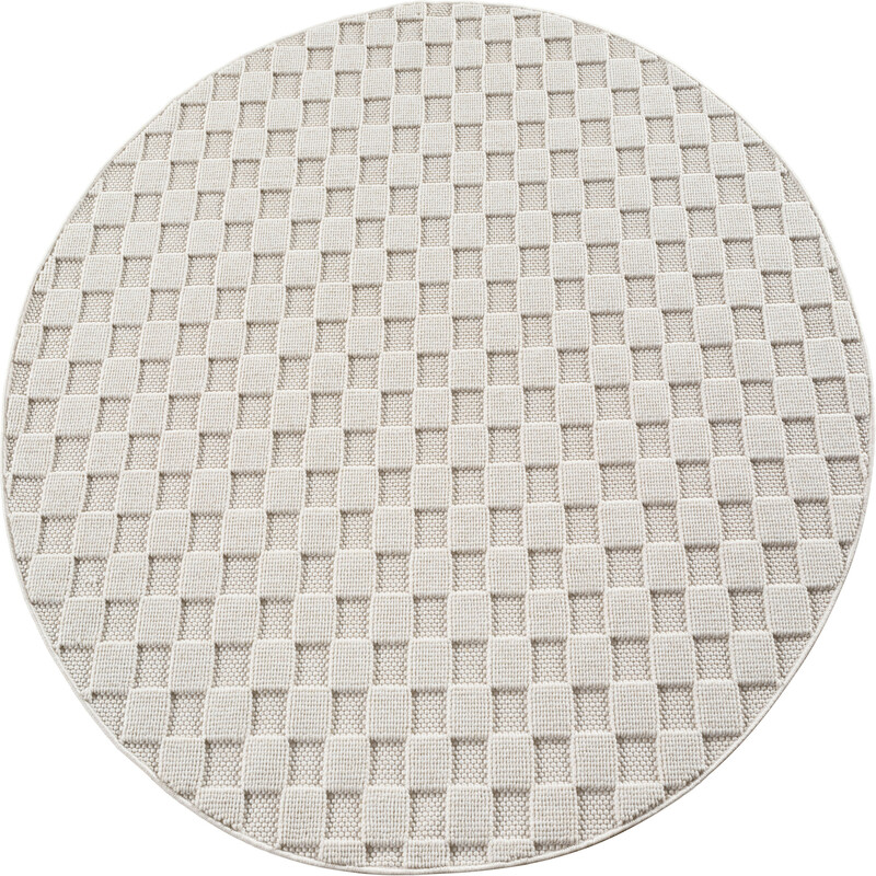 Moderný kruhový koberec, ktorý zaujímavým spôsobom mieša šedú a krémovú farbu. Z melírovaného podkladu potom vystupujú krémové obrysy geometrických tvarov. Tento podarený kúsok sa vyrába z polypropylénu heatset a kombinuje stredne vysoké slučky s vyšším strihaným vlasom, čo vytvára 3D efekt.