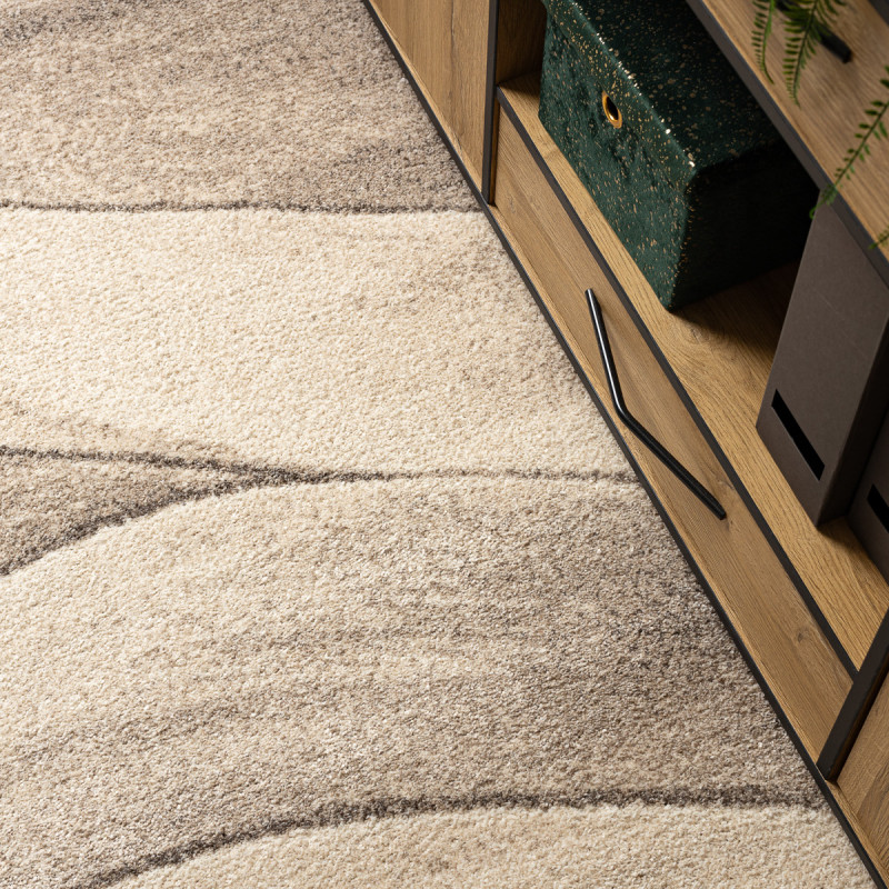 Koberec Fusion 1617 beige/cream pôsobí ako jemná hra svetla a tieňa. Pieskovo béžové a hnedé tóny sa vlnia v elegantných pruhoch, ktoré pripomínajú pokojné pohyby piesočných dún alebo tečúce vodné hladiny. Vďaka strihanému polypropylénovému vlasu je mäkký na dotyk a pritom praktický na údržbu. Precízne obšitie po celom obvode zaisťuje, že si koberec...