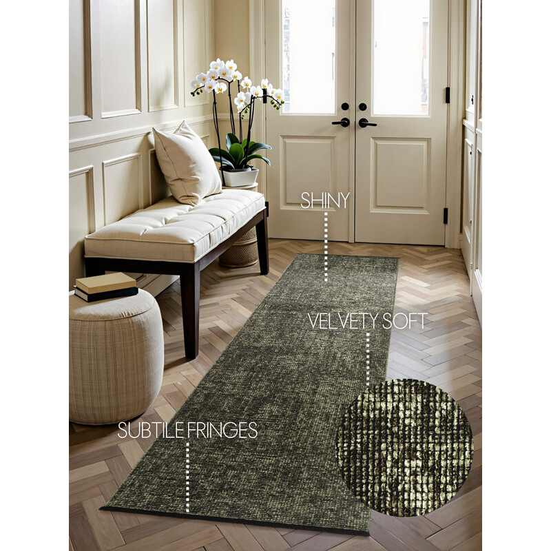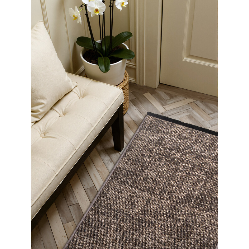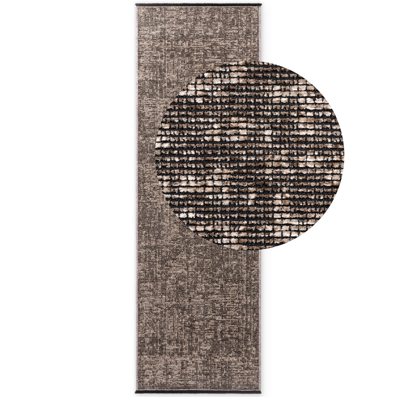 Hnedý behúň s jemným béžovým nádychom pôsobí ako mäkký obláčik, ktorý sa usadil priamo na podlahe. Jeho povrch s nízkym strihaným vlasom vytvára drobný mozaikový efekt, ktorý sa rozžiari pri každom svetelnom záblesku. Na kratších stranách ho ozdobne rámujú strapce, ktoré mu dodávajú veselú náladu, zatiaľ čo dlhšie strany sú úhľadne obšité pre dokonale...