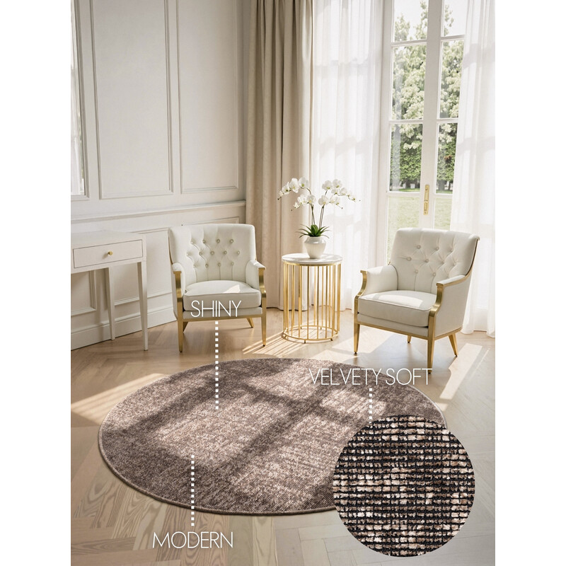 Hnedý kruhový koberec s jemným béžovým nádychom pôsobí ako mäkký obláčik, ktorý sa usadil priamo na podlahe. Jeho povrch s nízkym strihaným vlasom vytvára drobný mozaikový efekt, ktorý sa rozžiari pri každom svetelnom záblesku. Je úhľadne obšitý po celom obvode pre dokonale čistý vzhľad. Vďaka odolnému a ľahko udržiavateľnému materiálu si udrží svoj pôvab...