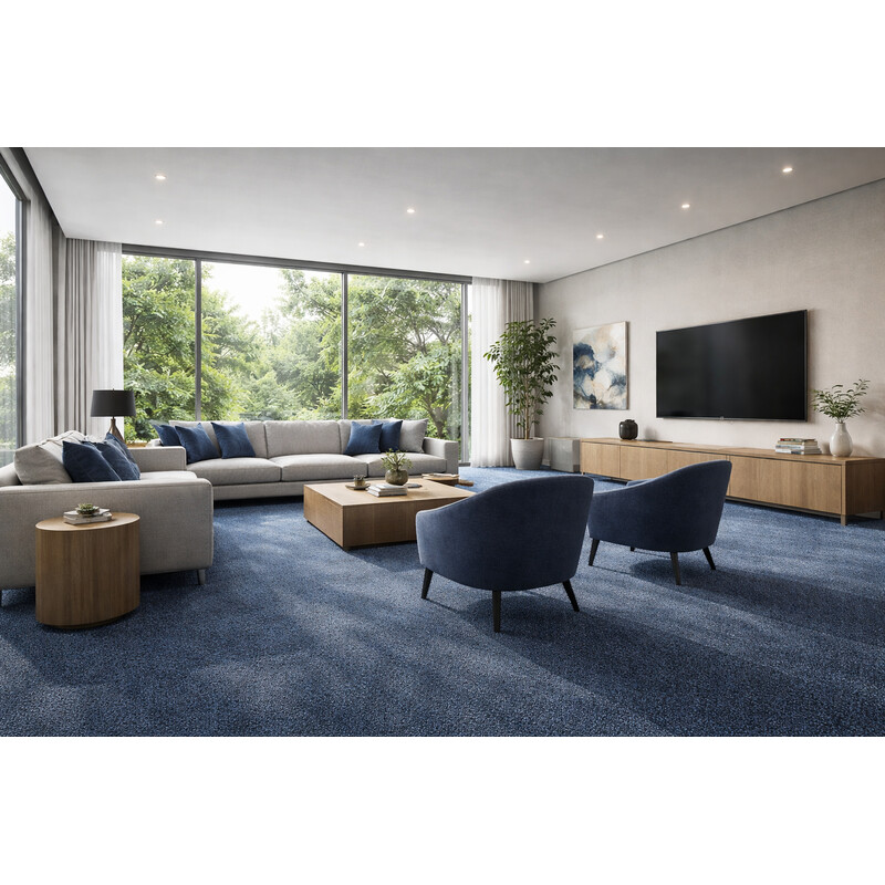 Tmavo modrý metrážny koberec sa bude skvele vynímať v každom komerčnom objekte. Vďaka krátkemu smyčkovému vlasu z polyamidu je veľmi odolný a môžete ho položiť nielen do miestností, ale aj na silne zaťažená schodisko. Iste Vás poteší i jednoduchou údržbou a efektívnym útlmom krokového i priestorového hluku.