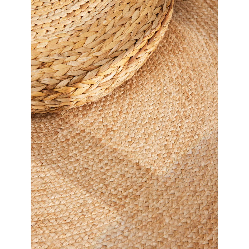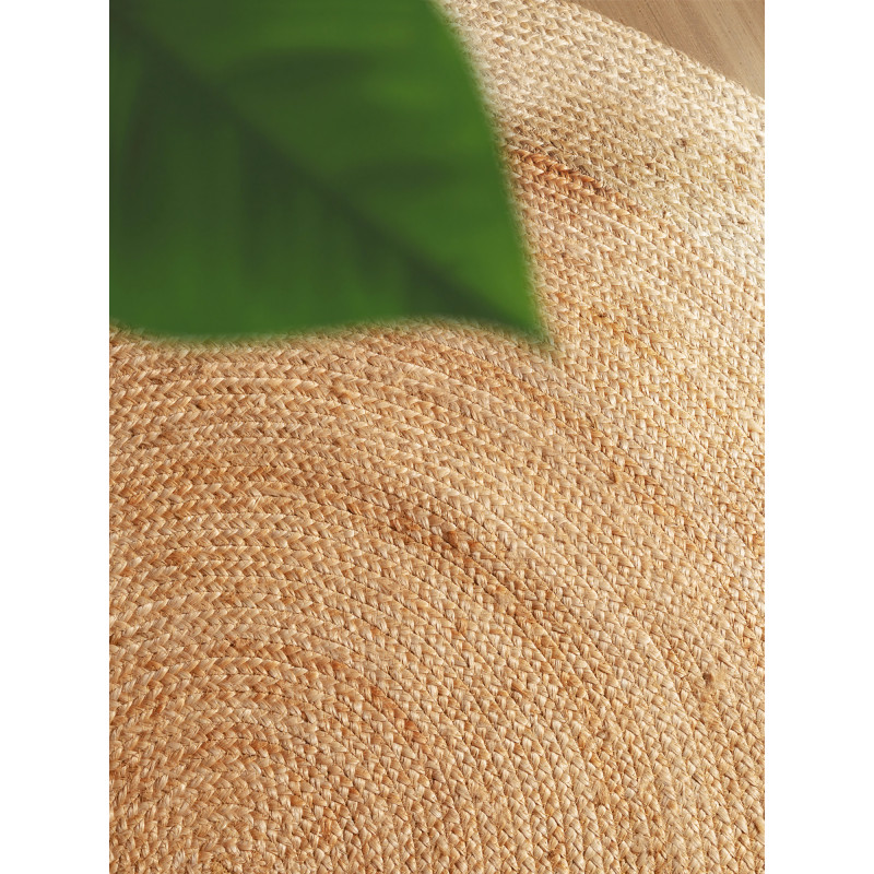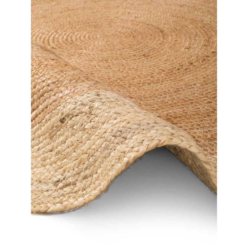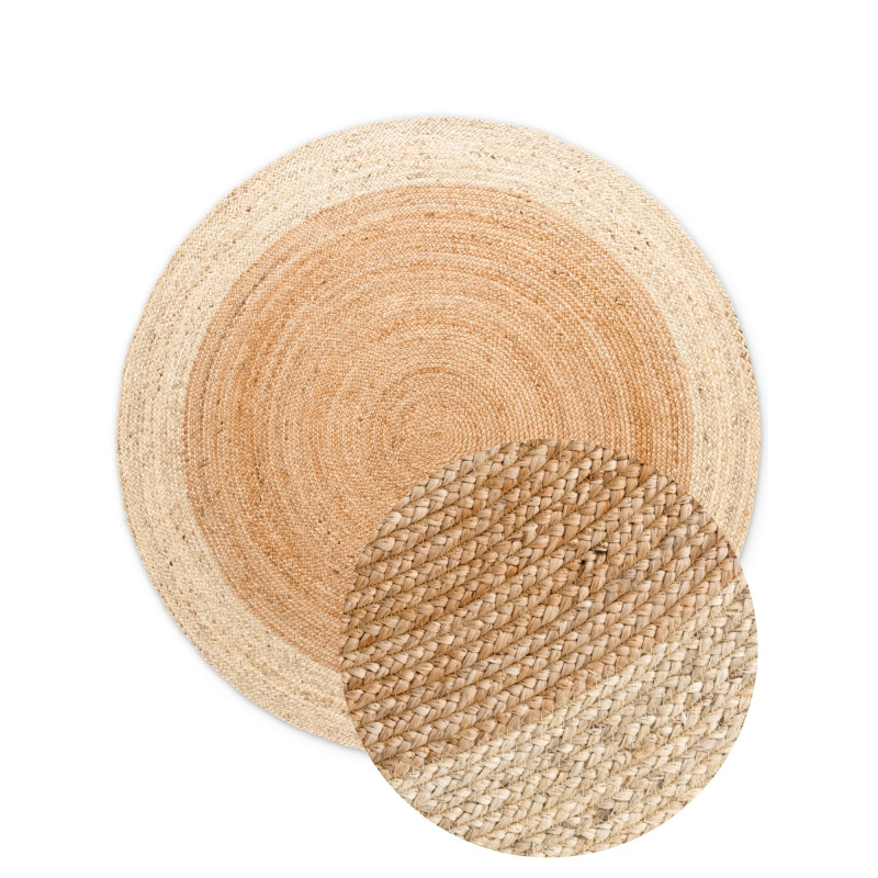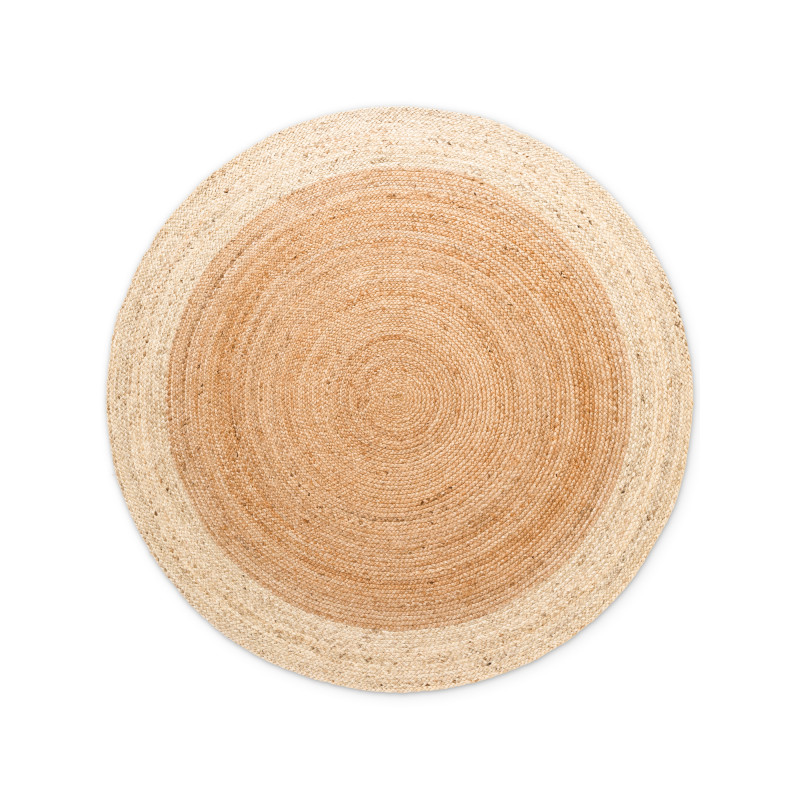 Okrúhly koberec Jutta z ručne tkanej prírodnej juty v teplej kombinácii slonovinovej a zlatej je jedinečný prírodný doplnok do interiéru aj na krytú terasu. Každý kus je originál vďaka ručnému spracovaniu a prírodne farbeným vláknam. Odolný, antistatický, certifikovaný OEKO-TEX a vhodný aj pre podlahové kúrenie.