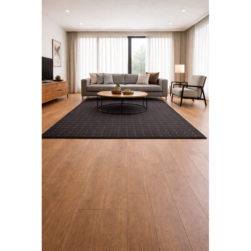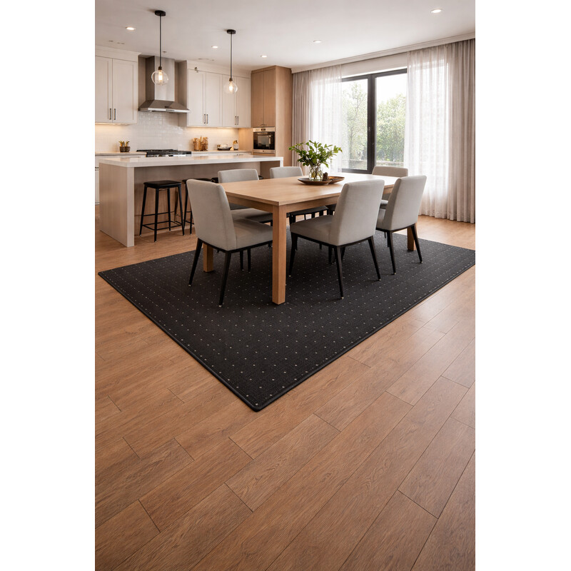 Koberec zaujme svojim elegantným čiernym odtieňom s jemným šedým nádychom, ktorý dodáva interiéru sofistikovaný a moderný vzhľad. Vďaka bouclé štruktúre je odolný a zároveň si zachováva minimalistický a prirodzený charakter. Jeho decentný dizajn umožňuje ľahké začlenenie do obývačky, spálne alebo chodby.