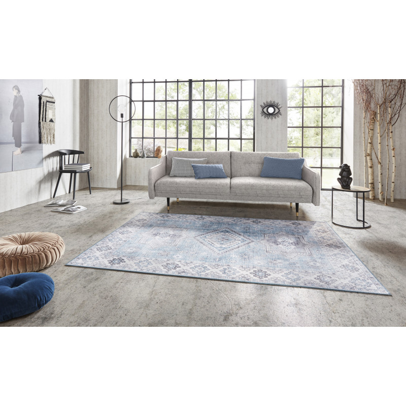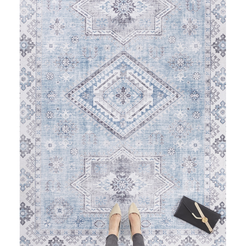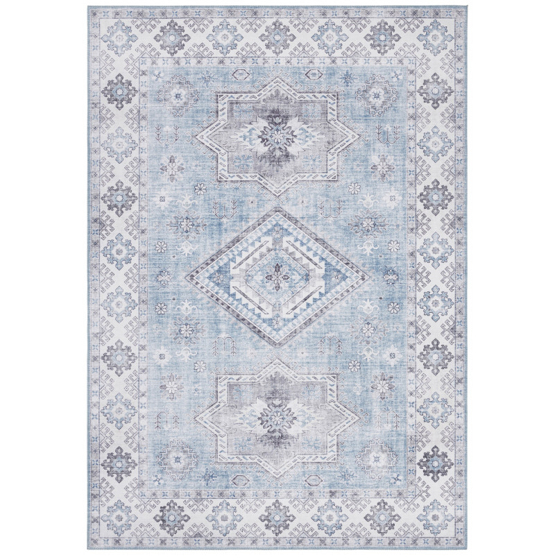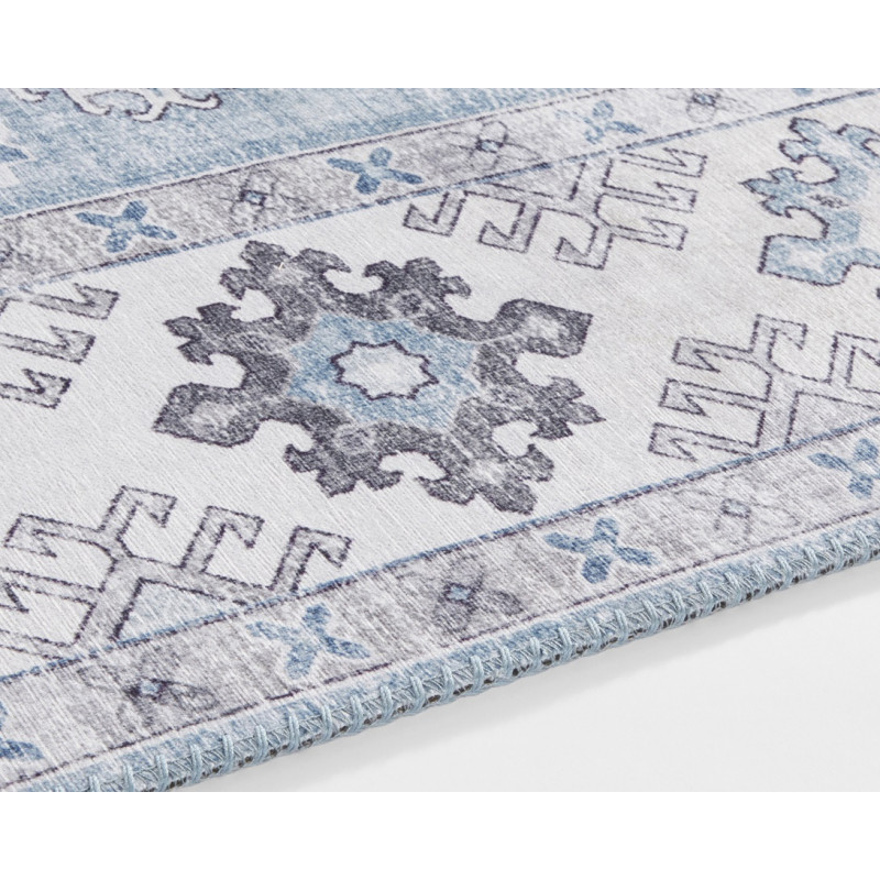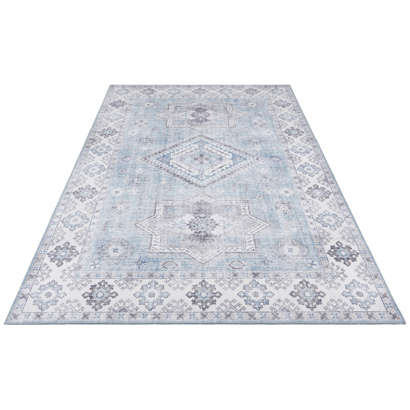 Svetlomodrý orientálny koberec s krémovými okrajmi a obšitím po celom obvode. Tento krásavec sa vyrába z polypropylénového vlákna, ktoré je odolné a príjemné na dotyk. V kombinácii so stredne vysokým strihaným vlasom je koberec mäkký a komfortný na došľap. Skvelá voľba predovšetkým do spálne alebo obývačky.
