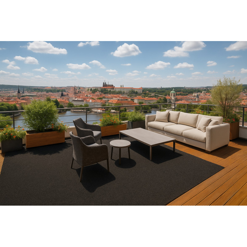 Metrážny koberec Wembley je jedinečný trávny koberec v čiernej farbe s bielosivými vláknami. Má vpichovaný nízky vlas, ktorý mu prepožičiava jednoduchú údržbu a čistenie pomocou vysávača, čo sa vo vonkajšom prostredí veľmi hodí. Uplatnenie nájde nielen vo vonkajšom prostredí, ale aj vo vnútorných priestoroch. Pre ľahký odvod vody z koberca slúži nopy na...