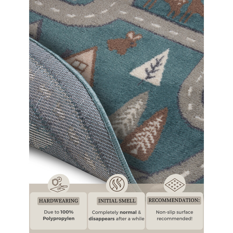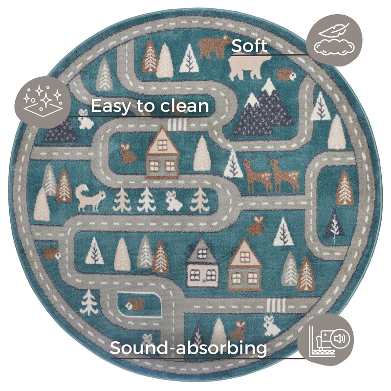 Tyrkysovo modrý kruhový koberec s cestou, ktorá sa vinie cez dedinky, lesy a hory, prináša deťom svet plný dobrodružstva. Zvieratá ako medvede, ježkovia, zajace, daniele a líšky oživujú celý dizajn a podporujú fantáziu. Jasné farby a detailné motívy robia koberec hravým a pútavým doplnkom. Mäkký povrch z polypropylénového vlákna poskytuje pohodlie, zatiaľ...