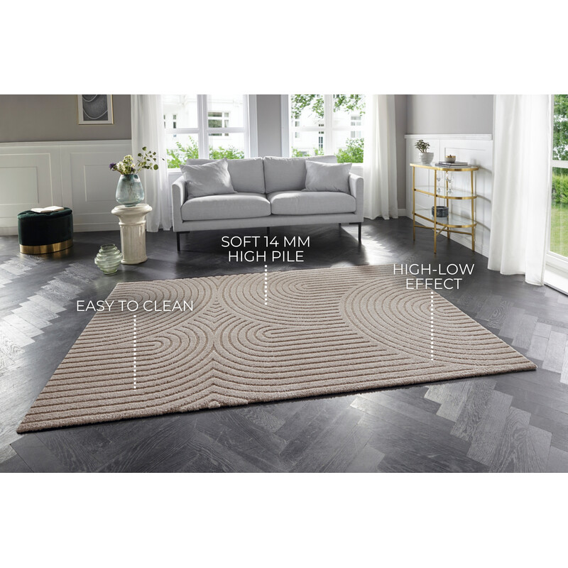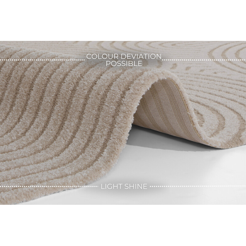 Tento koberec má vzor tvorený sústrednými oblúkmi a kruhmi, ktoré sa navzájom prepájajú. Tieto tvary vytvárajú 3D efekt, kedy niektoré časti vzoru vystupujú nad povrch koberca, zatiaľ čo iné zostávajú nižšie. Vzor má elegantný, minimalistický design, čo mu dodáva moderný a sofistikovaný vzhľad. Celkovo pôsobí veľmi jemne, najmä vďaka svetlo béžovému...