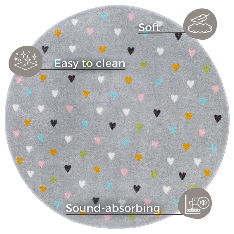 Šedý kruhový koberec s rôznofarebnými srdiečkami prinesie hravosť do každej detskej izby. Mäkký, ale odolný povrch zo 100% polypropylénového vlákna je ideálny na každodenné hranie. Stredne vysoký strihaný vlas zaisťuje pohodlie, zatiaľ čo obšitie po obvode predlžuje jeho životnosť.