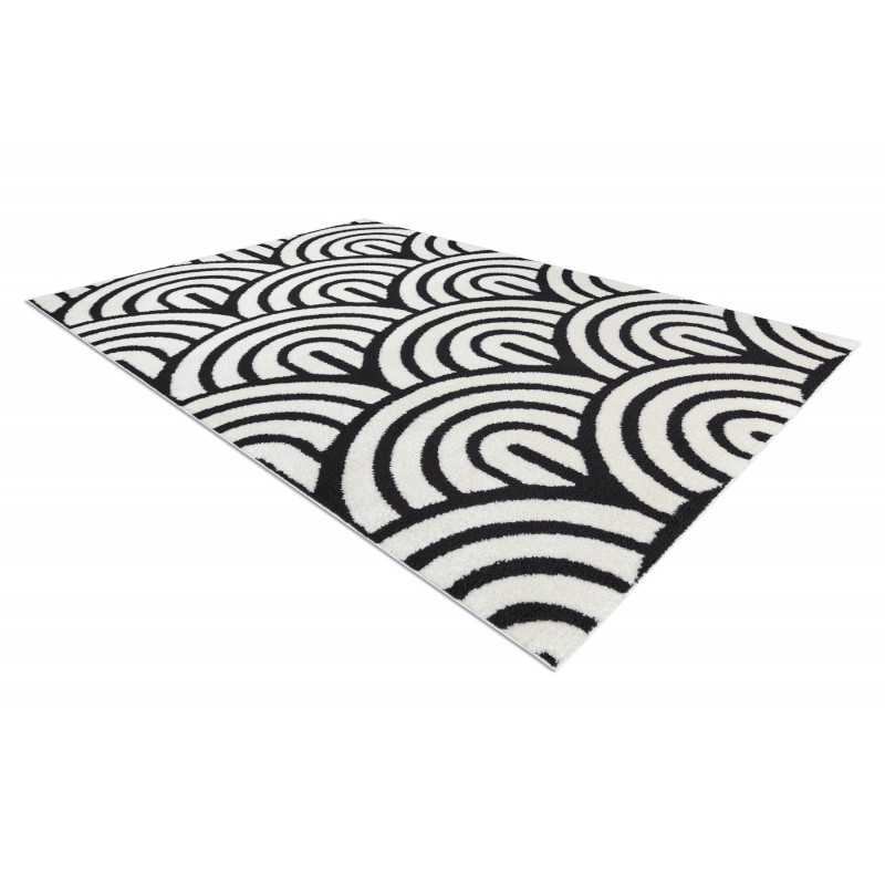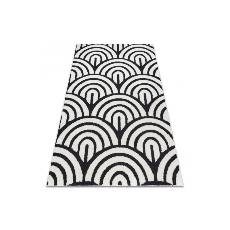 Tento koberec má vzor tvorený sústrednými oblúkmi a kruhmi, ktoré sa navzájom prepájajú. Tieto tvary vytvárajú 3D efekt, kedy niektoré časti vzoru vystupujú nad povrch koberca, zatiaľ čo iné zostávajú nižšie. Vzor má elegantný, minimalistický design, čo mu dodáva moderný a sofistikovaný vzhľad. Celkovo pôsobí veľmi jemne, najmä vďaka svetlo béžovému...