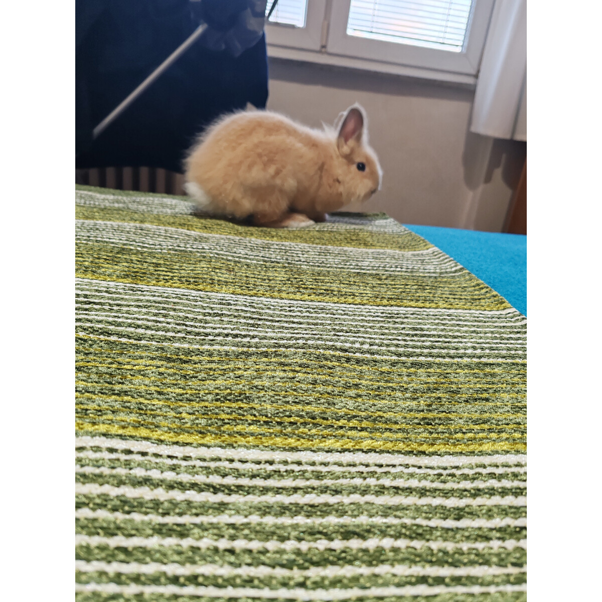 Koberec je v reálu hezčí než na fotce. První praní zvládl bez potíží. Králíčkovi se v kleci líbí a mě taky.