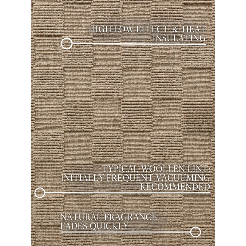 Vlna je prírodný materiál, ktorý sa získava z ovčej srsti. Má množstvo vlastností, vďaka ktorým je vhodná na výrobu kobercov. Tento koberec je teplý, mäkký, odolný, pružný a ľahko sa čistí. Okrem toho dobre izoluje zvuk a teplo a má antibakteriálne vlastnosti. Je to prémiový kúsok, pretože vlna dokáže regulovať mikroklímu - keď je v miestnosti príliš vlhko, nasaje do seba vlhkosť a potom ju postupne uvoľňuje. Krátko po vybalení môže mať koberec tendenciu mierne líhať, čo je pre vlnu normálne a trvá to niekoľko dní, maximálne týždňov (v závislosti od intenzity používania).