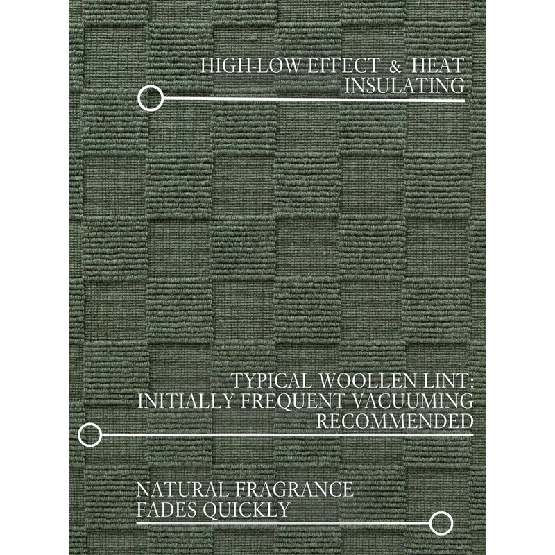 Vlna je prírodný materiál, ktorý sa získava z ovčej srsti. Má množstvo vlastností, vďaka ktorým je vhodná na výrobu kobercov. Tento koberec je teplý, mäkký, odolný, pružný a ľahko sa čistí. Okrem toho dobre izoluje zvuk a teplo a má antibakteriálne vlastnosti. Je to prémiový kúsok, pretože vlna dokáže regulovať mikroklímu - keď je v miestnosti príliš vlhko, nasaje do seba vlhkosť a potom ju postupne uvoľňuje. Krátko po vybalení môže mať koberec tendenciu mierne líhať, čo je pre vlnu normálne a trvá to niekoľko dní, maximálne týždňov (v závislosti od intenzity používania).